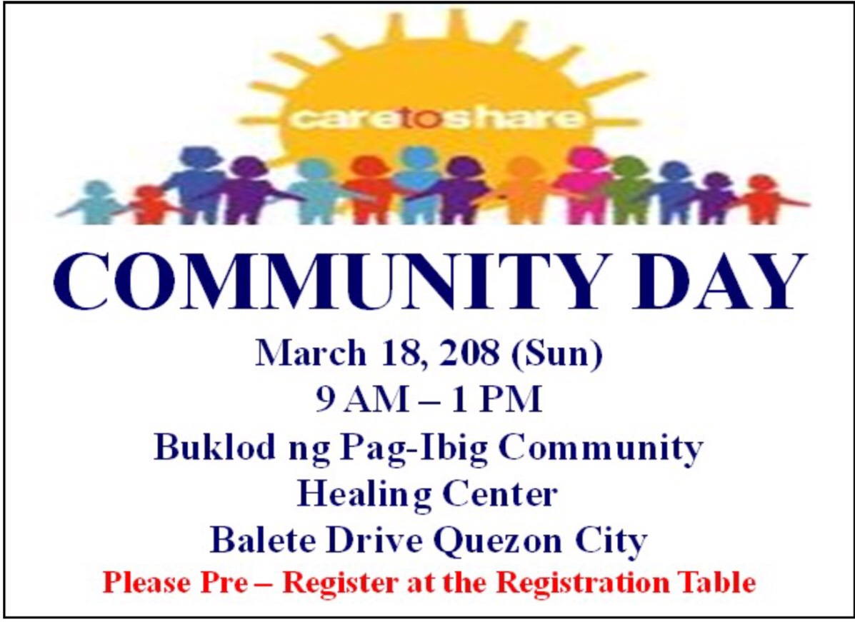 Buklod Ng Pag-Ibig Buklod ng Pag-ibig Community, #97 Balete Drive Extension, New Manila, Quezon City, PhilippinesPlease Pre-Register at the Registration Table Eucharistic Celebration by Fr. Joy Sebastian. On March 18, 2018 (Sunday), 9am-1pm at the Buklod ng Pag-Ibig Healing Center, Balete Drive, Q.C.
