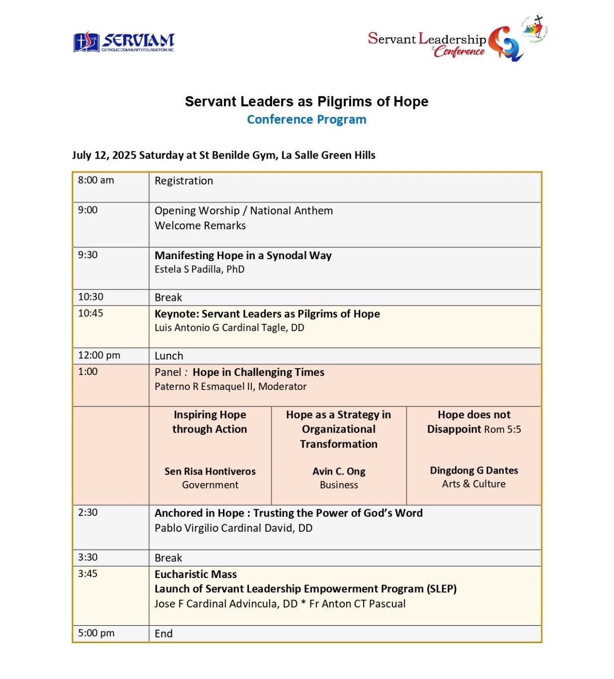In our Jubilee Year, the Serviam Catholic Community Foundation, Inc held the one-day conference entitled Servant Leaders as Pilgrims of Hope on July 12, 2025 Saturday, at the St Benilde Gym in La Salle Green Hills, 343 Ortigas Avenue, Mandaluyong City.